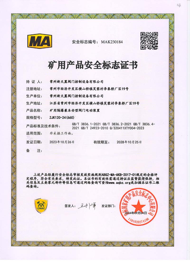 礦用產(chǎn)品安全標(biāo)志證書ZJK120-24(660)