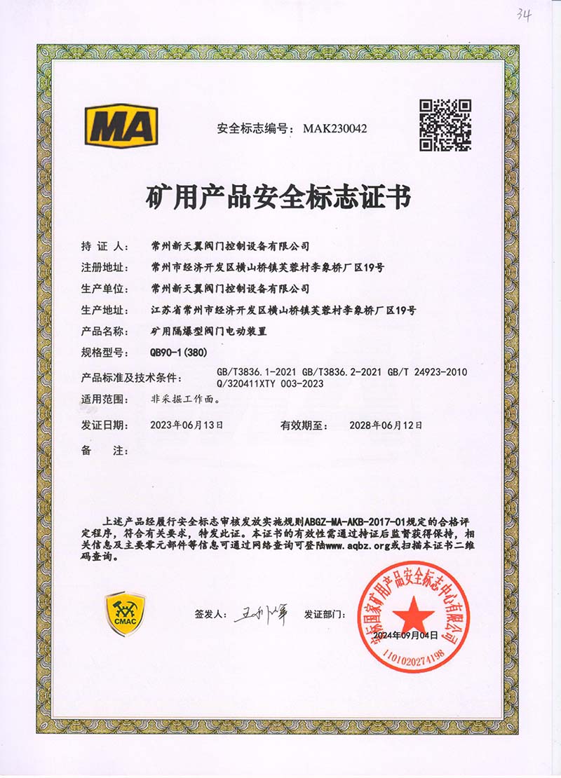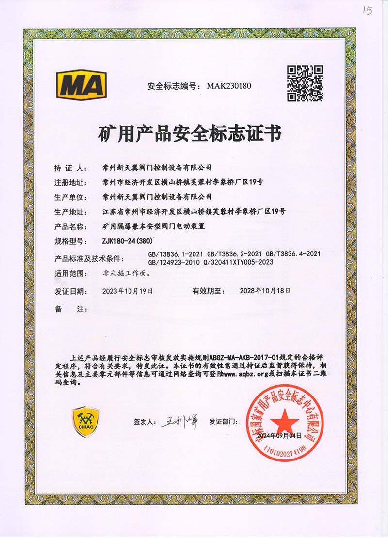 礦用產(chǎn)品安全標(biāo)志證書ZJK180-24(380)