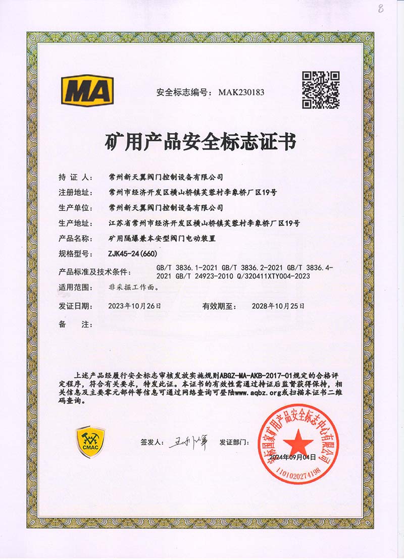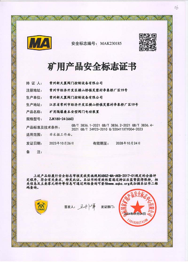 礦用產(chǎn)品安全標(biāo)志證書ZJK180-24(660)