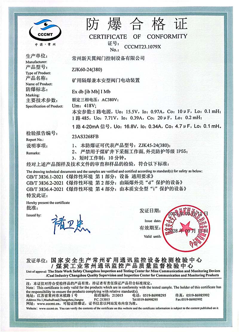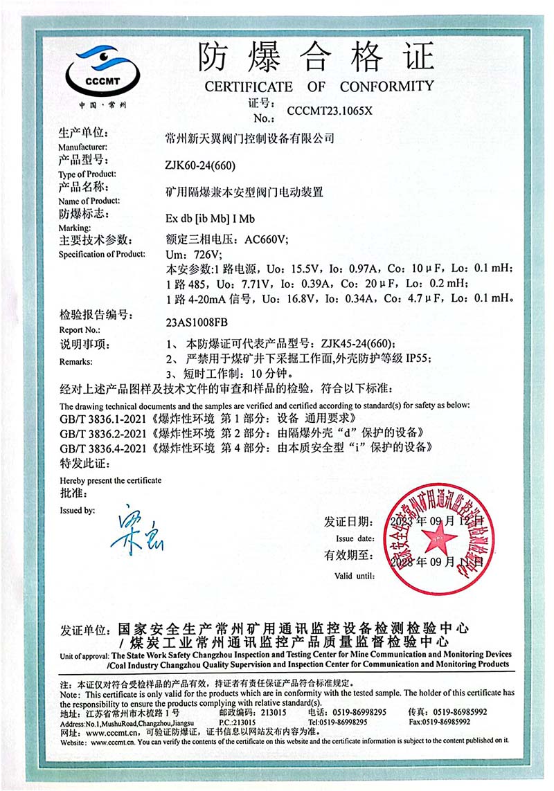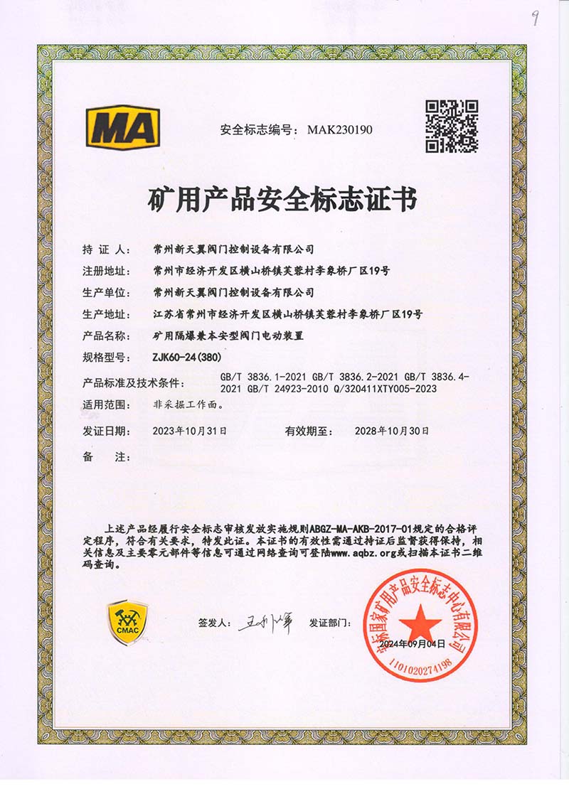 礦用產(chǎn)品安全標(biāo)志證書ZJK60-24(380)