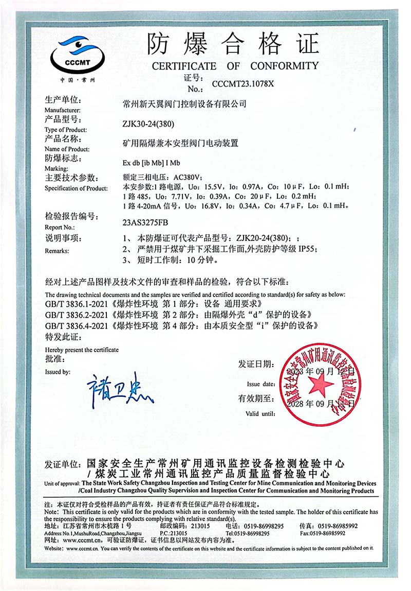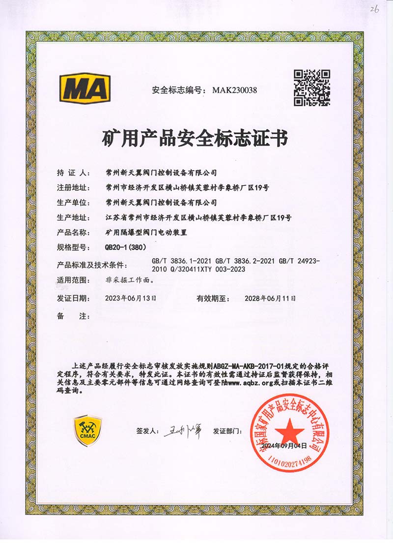 礦用產(chǎn)品安全標(biāo)志證書ZJK20-24(380)