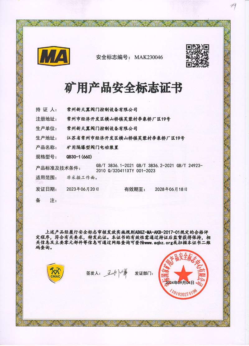 礦用產(chǎn)品安全標(biāo)志證書ZJK30-24(660)