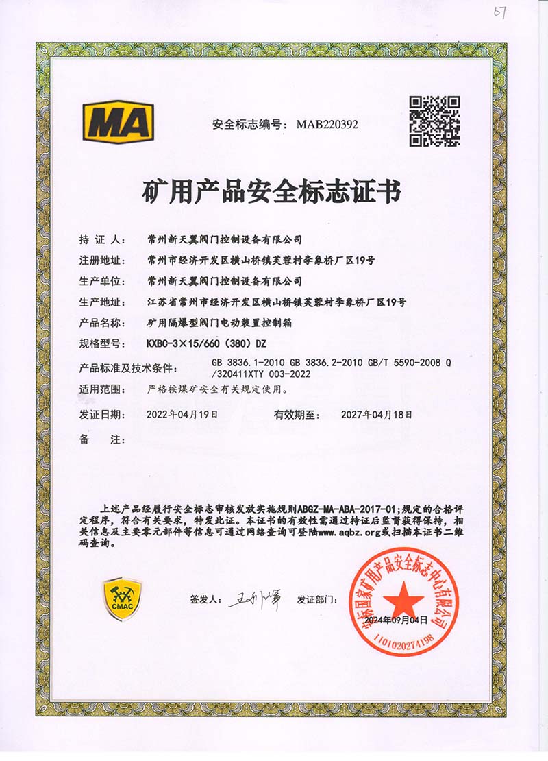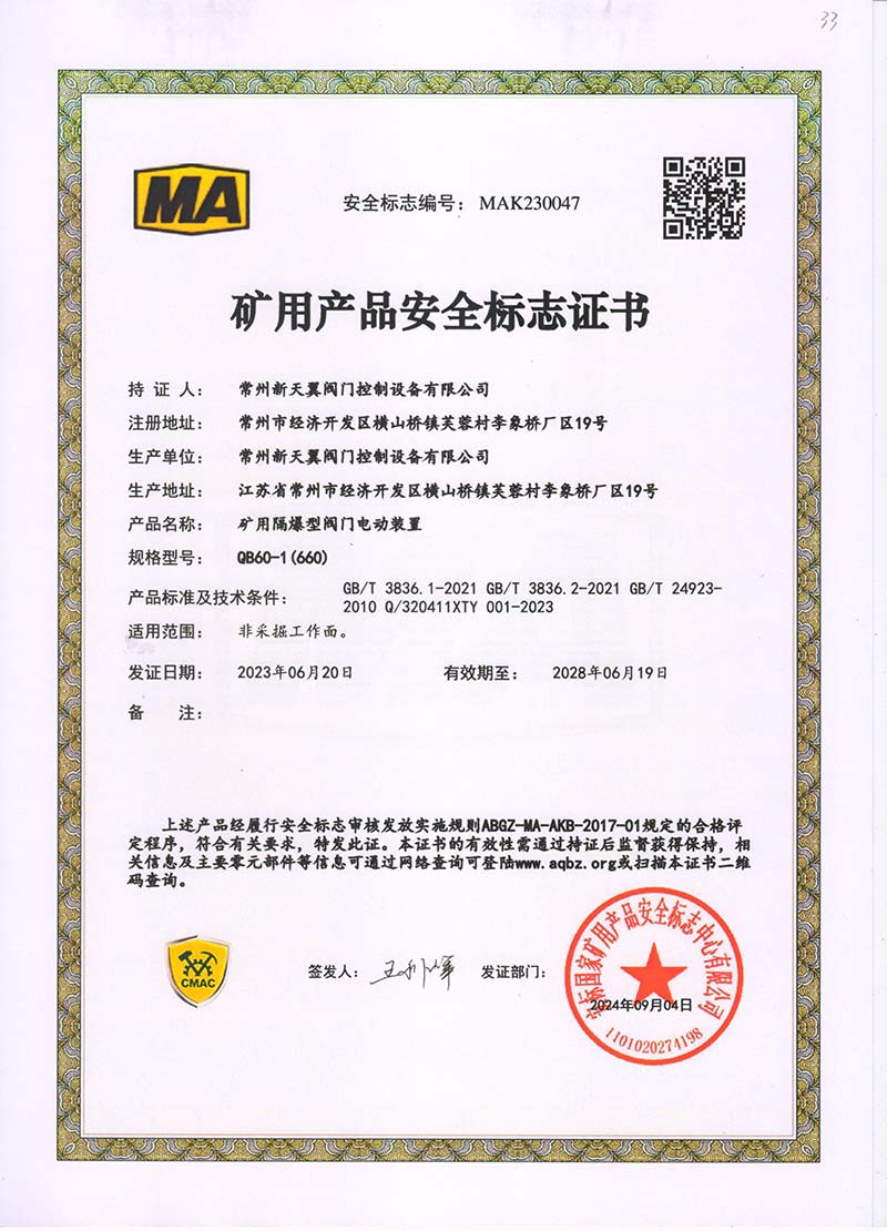 礦用產(chǎn)品安全標(biāo)志證書ZJK60-24(660)