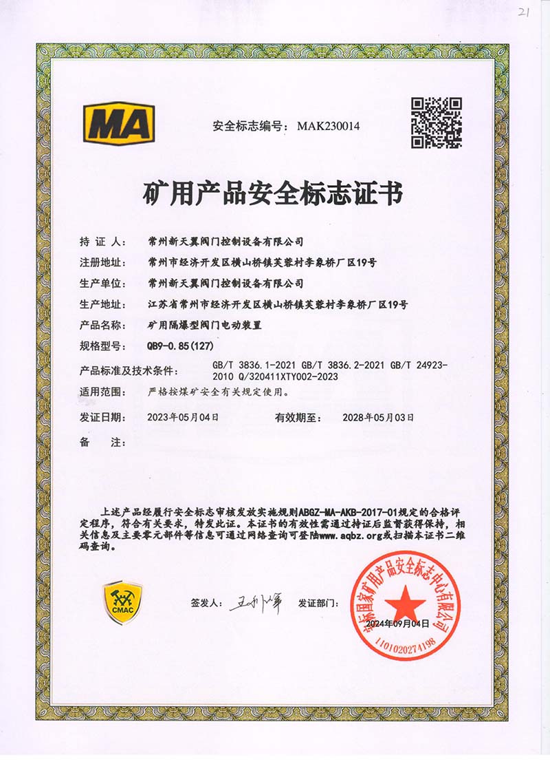 礦用產(chǎn)品安全標(biāo)志證書QB25-0.6(127)