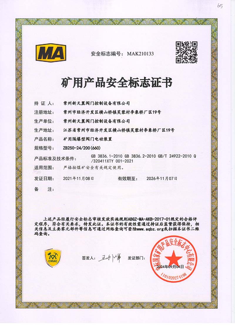 礦用產(chǎn)品安全標(biāo)志證書ZB30-24 200(660)