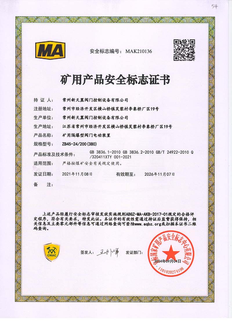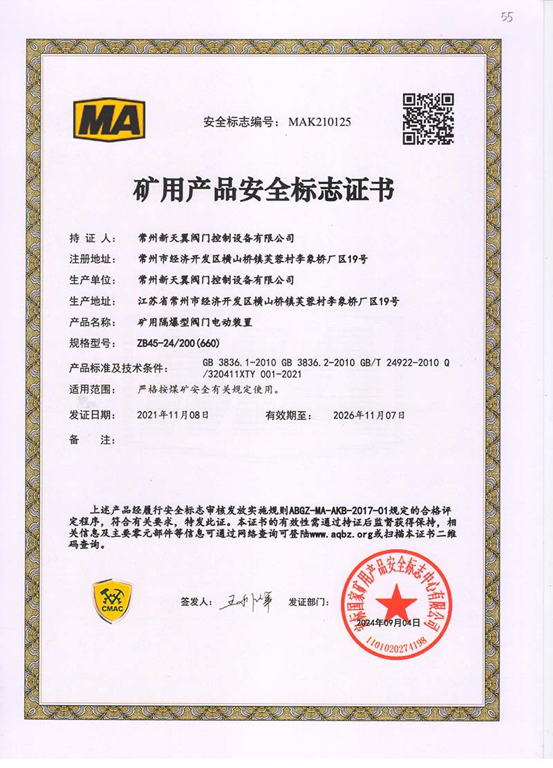 礦用產(chǎn)品安全標(biāo)志證書ZB60-24 200(660)