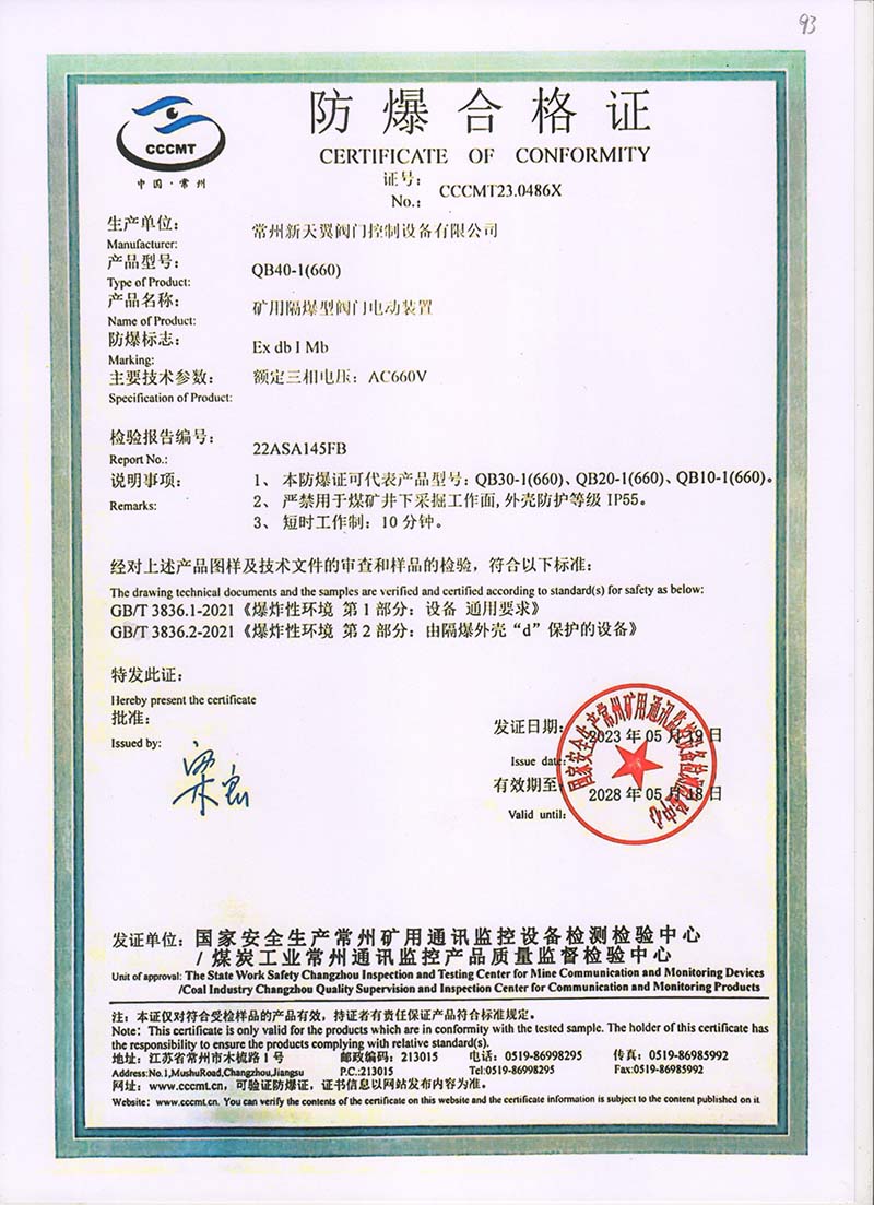 礦用產(chǎn)品安全標(biāo)志證書QB40-1(660)