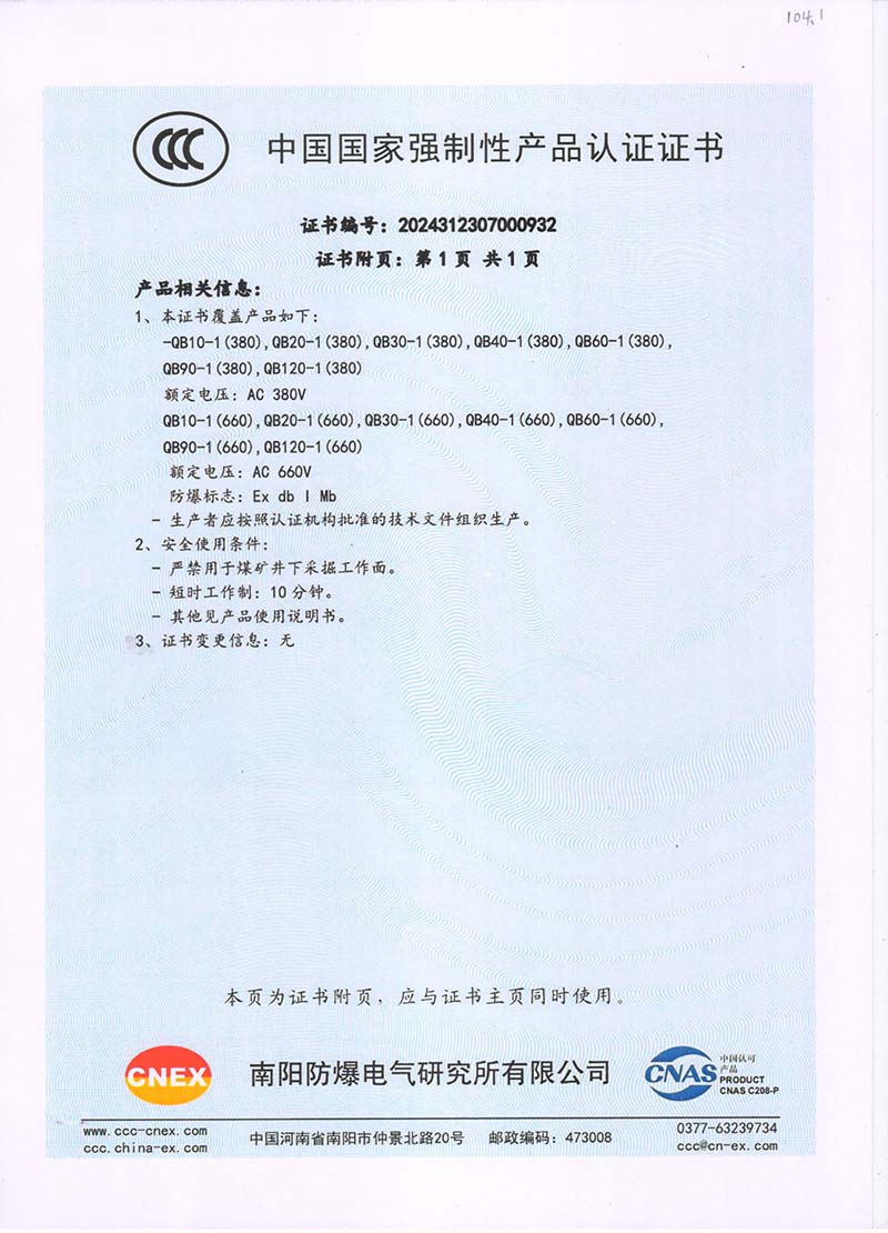 礦用隔爆QB(380V 660V) 國家強制性產(chǎn)品認(rèn)證證書104.1